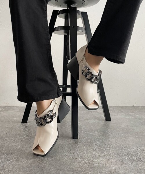ーーー オープンスクエアトゥに大きめのチェーンの組み合わせが存在感抜群の一足 チェーンのブラックメタルのカラーが目を惹きモードなスタイリングに◎ 太目なデザインヒールで安定感もあり、横から見ると更にモード感UPなヒールもポイントです。 ーーー サイドのファスナーで着脱が出来るのも嬉しいポイント。 シンプルなスタイリングの引き締めアイテムとしておススメです。 〈注意事項〉 ・サンプルにて撮影をしておりますので、実際の商品とは素材や仕様・加工・サイズ等が若干異なる場合がございます。 ・モニター・環境等により実際の商品と色味が多少異なって表示される場合がございます。予めご了承をお願いいたします。 ・撮影環境により、光の当たり具合で色味が違って見える場合があります。あらかじめご了承下さい。