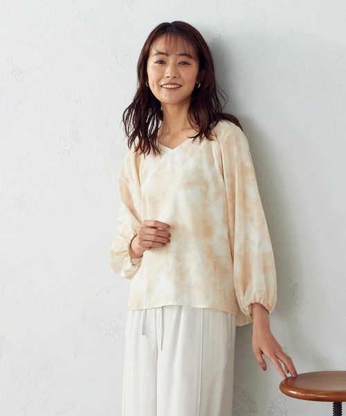 《素材》 綿ライクな肌ざわりが特徴のポリエステル素材です。 フワッとしながらもサラサラ感のある新感覚な素材になります。 春らしい優しい印象のタイダイ風のプリントに仕上げました。 《デザイン》 タイダイ風プリントが新鮮な、 透け感のある春先取りのプルオーバーブラウスです。 衿ぐりはVネックデザインでお顔回りをスッキリとみせてくれます。 衿ぐりと袖口のボリュームあるギャザーが、 女性らしくリラックス感のある優しい雰囲気です。 袖口には細ゴムを通しているのでお好みの袖丈が楽しめ、 両脇スリット&丈の前後差は軽い着こなしの印象になります。 ※画像の商品はサンプルとなりますので実際の商品と仕様、加工、サイズが若干異なる場合がございます。 ※こちらの商品はFIVE FOXes独自の採寸方法となっています。 本サイトのサイズガイドと採寸方法が異なる場合がありますのでご了承ください。