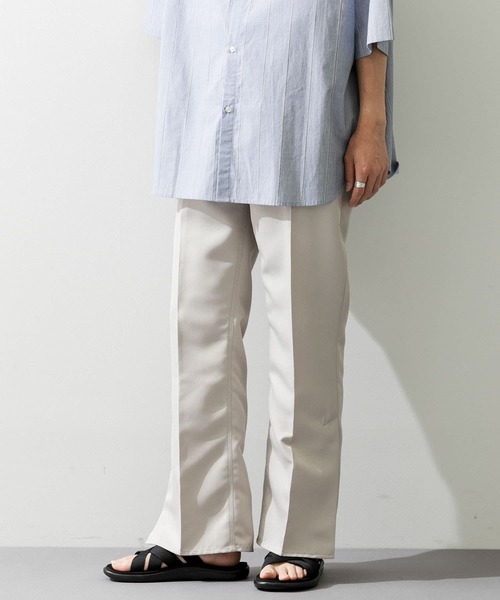 欲しいが形に!人気スタッフ『わたべ』が企画したアイテム!センタープレスの入った美シルエットスタプレ系パンツの進化系 スリット入りパンツ○セットアップでワンランクアップのおしゃれ上級者に○今季1推しのグリーンも展開!わたべコメント鮮度のあるアイテムのため、どんなスタイルに合わせてもトレンドライクなスタイルに仕上がります。美シルエットでタックインスタイルで足長効果も期待でき、レングスが少しシューズにかかるくらいでスリットやフレア感をきれいに出すことが出来ます。ベストやジャケット等モードな印象のスタイリングとの相性が抜群です。STAFF STYLINGinstagramWEARmaterialハリ感と落ち感がありシワになりづらい生地を使用しております。【シリーズアイテム】AA24-17A009 1st type Gジャン(セットアップ対応)AA24-14A011 センタープレスストレートパンツAA24-12A014 ストレッチVネックベスト※商品画像は、光の当たり具合やパソコンなどの閲覧環境により、実際の色味と異なって見える場合がございます。予めご了承ください。※商品の色味の目安は、商品単体の画像をご参照ください。▼お気に入り登録のおすすめ▼お気に入り登録商品は、マイページにて現在の価格情報や在庫状況の確認が可能です。お買い物リストの管理に是非ご利用下さい。-----------------------------透け感:なし伸縮性:なし裏地:なし光沢:ややありポケット:あり-----------------------------