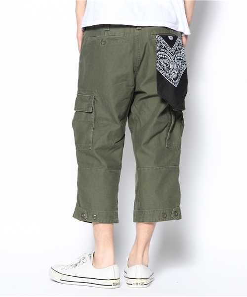 太めルーズシルエットのクロップドカーゴパンツ。黒のバンダナ付きです! model:H175 B78 W72 H90 着用サイズ:44 ベージュ 着用サイズ:48