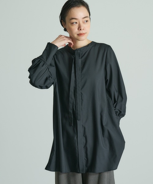 Anniversary of PUAL CE CIN ーBLACK collectionー ピュアルセシンが提案【ハレの日】を彩るブラック ◇前後で違うデザインが嬉しい大人ブラウス◇ ●デザイン 前後でデザインの差があり、着回しを楽しめる1着です。 ピンタック風ステッチとスタンドカラーはクリシカルな印象。 胸下までの縦ステッチは、ジャケットのインに見せても着映えします。 切り替え下のギャザーは縦に影が落ち、1枚で着た時にすっきりと見せます。 ボウタイ面は比翼付きで前開きです。 細めのリボンは上品なイメージで、ネックレスをせずにも華やかな首周りが叶います。 お仕事などフォーマルなシーンにもオススメです。 袖口はギャザーを施し全体のシルエットにほんのり丸みをプラス。 バランス良くふんわりと、女性らしいコーデにオススメなブラウスです。 ●カラー展開 使いやすいオフ、春らしいベージュ、ベーシックなブラックの3色展開。 ●素材 とろみのある滑らかな生地で、サラッと肌なじみの良い質感です。 艶のある見た目で上品な素材感です。 ●スタイリング ステッチ面ならチュニックブラウスとしてセンタープレスのパンツコーデがオススメのスタイリング。 ボウタイ面は、お仕事使いならジャケットやカーディガンの中に◎ カジュアルな普段着コーデでしたら、プルオーバーの首元からリボンを出せばレイヤードスタイルで楽しめます。 ============================ 透け感:オフのみややあり 裏地:なし 伸縮性:なし 光沢感:あり 生地の厚さ:薄手 【スタッフコメント】 年齢:30代後半/身長:154cm/普段着用サイズ:Mサイズ サイズ感:シルエットの通り全体的にゆとりがありインナーを着こんで使えそうです。 生地が柔らかいので広がり過ぎずスッキリと着られました。 素材感:つるんとした柔らかく、心地良い生地感です。 =============================== ※撮影場所やお使いのモニター環境により若干お色味が異なる場合がございます。特にロケの撮影では明るく見える傾向にございます。 ※予約商品はサンプルで撮影をしております。若干の仕様が変更になる場合がございますので予めご了承の上ご注文くださいますようお願いいたします 。