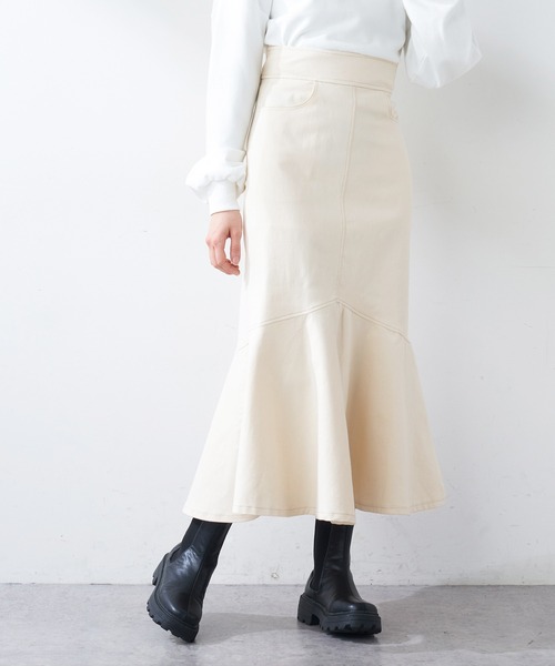 動くたび揺れ感が可愛いマーメイドスカート ■デザイン ・裾切り替えでラッフルシルエットが特徴。 ・後ろ下がりの切り替えがレディライクな印象に。 ・ストレッチを効かせているので、履き心地も良いです。 ・ウエストの後ろ部分がゴムになっていてるので着脱しやすく、タックインしても綺麗に見えます。 ■カラー ・アイボリー、ワンウォッシュ(デニム)、ブラック(ブラックデニム)にWEB限定カラー/スミクロ(ギンガムチェック柄)の4色展開 ■スタイリング ・短丈トップスとの相性◎カジュアルなロゴ入りトップスやスウェット合わせがオススメ。 ・足元はサイドゴアブーツや厚底シューズで重めにするのが旬見えです♪ ・オーバーサイズのトップスは、裾の前だけをタックインして着ていただくとバランスよく着ていただけます。 ・どんな春アウターでも、腰回りがスッキリしたマーメイドスカートなので、もたつくことなくスッキリ着ていただけます。 ----------------------------- 裏地:あり(スミクロ) 光沢感:なし 透け感:なし 伸縮性:ややあり ----------------------------- model:165cm ※着用、お取り扱いの際は、商品についている品質表示とアテンションタグを必ずご確認下さい。 ※ご覧のモニター環境や撮影環境により実際の商品と多少色味が異なって見える場合がございます。 ご理解の程よろしくお願いいたします。 【デニム】 デニム製品の特性上、着用や洗濯によって「色落ち」「色移り」が生じます。 デニム製品の特性をご承知の上、色合いの変化をお楽しみください。 ・ご着用中の摩擦等により移染します。白・淡色系の衣服、ハンドバッグ、靴、シート等は特にご注意ください。 ・デニム製品が雨水や汗で濡れると、より色移りしやすくなります。 ・洗濯により洗液がにごり移染しますので、他のものと一緒にしないで単独でお洗いください。 ・洗濯後濡れた状態で放置されますと色移りしやすくなります。 ・色移りしやすいため、下着やインナーには暗いカラーのものを着用いただくことをお勧めいたします。 ■お気に入り登録のおすすめ 【気になるアイテムを登録】 ハートをクリックしてお気に入りに登録すると 完売カラーの再入荷やラスト1点の通知、セールの通知を受けとることができます。 【ブランドを登録】 新商品や再入荷、セール通知など、いち早くブランドの情報を受けとることができます。