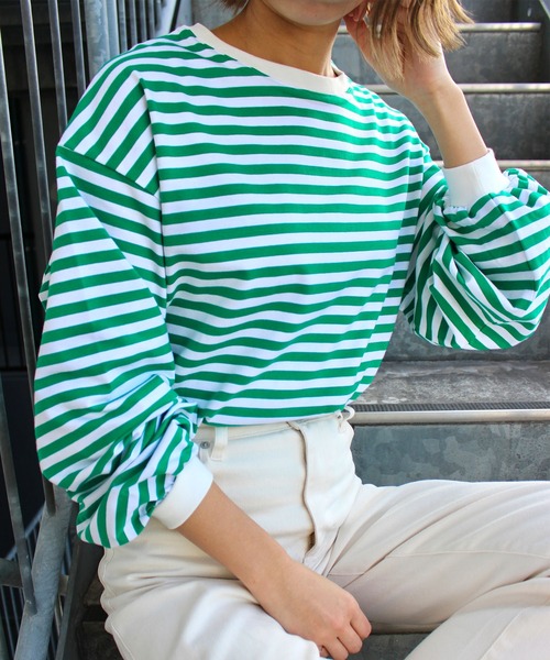 2022 SS 春夏 WEB限定 トレンドアイテム 【ボーダーのデザインが季節感、ラフ感を演出】 ふんわりとしたサイズ感が楽チンな着こなしと抜け感ある仕上がりに ▼Design ・襟元と袖元の配色デザインが引き締まりのある仕上がりに。 ・豊富なカラーバリエーションがコーディネートを華やかにしてくれます。 ・袖のふんわりとしたサイズ感がゆるっとこなれた印象に。 ・オーソドックスなボーダーデザインがシンプルで落ち着いた仕上がりに仕立ててくれます。 ▼Fabric ・肌触りの良いさらっとした質感の生地が快適な着心地に。 ・伸縮性もしっかりとあるので着やすさも抜群です◎ ▼Styling ・カジュアルなアイテムですがフォーマルアイテムと合わせればオフィスカジュアルにも◎ ・ワイドパンツやジョガーパンツと合わせればゆるっとしたリラクシングなコーデに。 ・ロンT単品でももちろん良いですが、他アイテムに肩掛けしたスタイルではトレンドを抑えたコーデに。 ・タックインスタイルの着こなしではラフでカジュアルなスタイルにも。 ----------------------------------------- 【以下オフホワイト/クロ参考。カラーにより多少の誤差あり】 ・透け感:なし ・伸縮性:あり ・生地の厚さ:普通 ・裏地:なし ----------------------------------------- 【スタッフ着用コメント】 身長159cm シンプルなボーダーのデザインがかわいらしく、ラフな仕上がりに仕立ててくれます。スカートからパンツまで、 ボトム全般と相性が良いのでコーデの幅が広がる事間違いなしです◎タックインのスタイルからアウトのスタイル、 ワンピースや薄手のニットに肩掛けとスタイリングも様々なので楽しみ方も満載のアイテムとなっています。 カーディガンやジャケットの羽織りのインナーとして、ボーダーをチラ見せするのもかわいくこなれた印象になるので おススメの見せ方です。