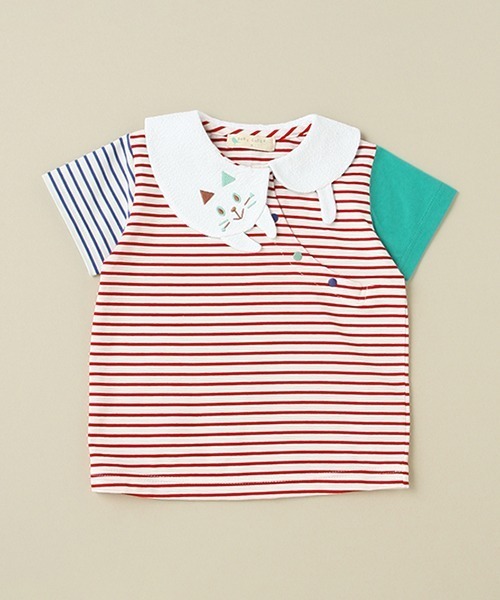 衿にあしらったネコ刺しゅうがアイキャッチポイントの半袖ブラウスです。色切替した袖のカラーが元気な印象をプラス。主役のボーダー柄はデイリーカジュアルな装いにぴったりです。前開きのスナップで着脱も簡単。天竺を使用しているので動きやすく、着心地も良好です。【透け感】透けない【生地の厚さ】普通【伸縮性】なし【裏地】なし【ポケット】なし