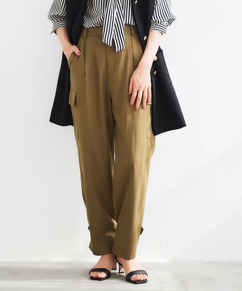 【裾アレンジで雰囲気チェンジも◎】 2way仕様のヘムデザインでシルエットアレンジが楽しめるカーゴパンツ。 裾タブを前でとめると裾が絞られた今年らしいシルエット、 後でとめるとベーシックなストレートシルエットで着て頂けます。 カーゴパンツといえばコットン素材のものが多いですが、あえて合繊混のツイル素材にすることで、 きれいめもカジュアルも合わせやすいクリーンなムードに仕上げています。 ==================== 透け感:なし 裏地:なし 伸縮性:ややあり 光沢感:あり 生地の厚さ:普通 ====================