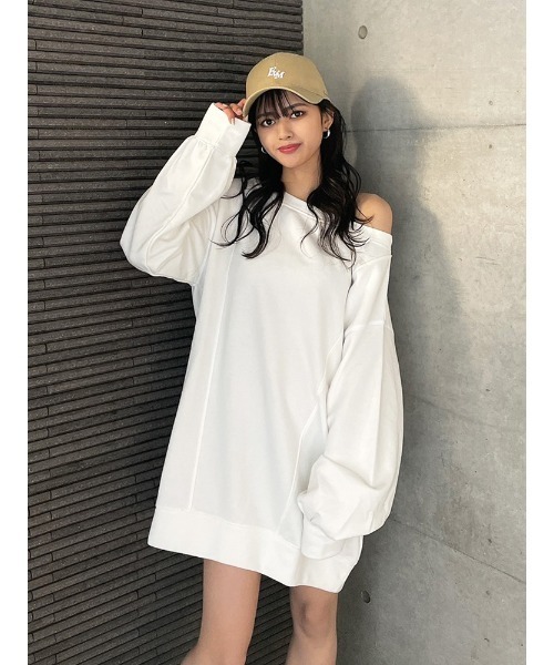 カジュアルな印象の裏毛素材のオーバーサイズOPです。 オフショルダーのデザインになっているのでヘルシーな肌見せが叶う1着です。