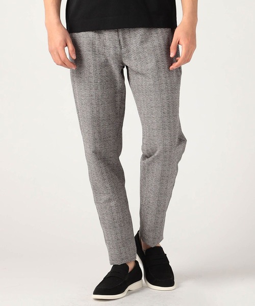 生地の縮率差でリップル(凹凸)感を出したオリジナルのシアサッカー素材のデザインイージーパンツです。掠れたヘリンボン柄の転写プリントの2色と、無地のネイビー展開になります。タテヨコのマルチストレッチ性、エアリーな軽さとシャリっとした風合いが特徴で、このペーパーライクな軽い薄さと張り感が他には無い素材感で吸水速乾の機能も備えています。後ベルトに平ゴムを入れてスピンドルは見えない様に内側に入れる仕様で、前からはスラックス風に見える様に作ったビジカジ仕様です。裾口にかけてテーパードラインを強くした細身シルエットで、ベルト裏や袋布にストレッチ裏地を採用して表素材に追従するストレスフリーな穿き心地、清涼感を高めた仕上がりです。<br>※同素材ジャケットとのセットアップでの着用がおすすめです。同素材ジャケット=シアサッカーデザインジャケット(品番:2164-3501)