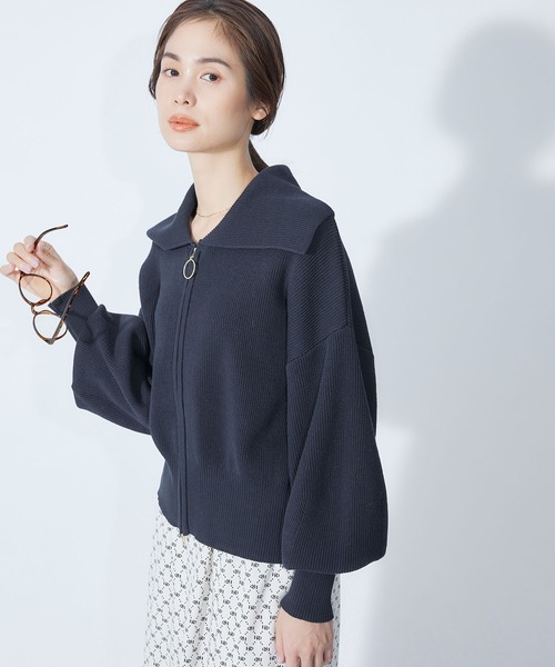 【素材】オーガニックコットンとポリエステルの混紡糸に更にハリを持たせ編み目をキレイに立たせるためポリエステルをプレーティング。こちらで使用しているポリエステルは全てリサイクルなので環境に配慮したサスティナブル素材です。【デザイン・シルエット】トレンドのセーラーカラーのカーディガン。適度なボリュームスリーブ、長めのリブでメリハリを付けた立体的なフォルムのショート丈のボディバランスがスタイルアップして見えます。フロントを閉じてプルオーバーのように着ても様になるデザインです。【カラー】マリンの雰囲気を感じられるアースカラー3色展開【おすすめのスタイリング】タイトでもボリュームでもスカート合わせがおススメ。逆開ファスナーを裾の方だけ少し開いてくびれのシルエットを作ってもこなれ感がでます。ワンピースの上にさらっと羽織っても素敵です。----------------------------透け感:なし裏地:なし伸縮性:あり光沢感:なし生地の厚さ:中肉ポケット:なし洗濯方法:手洗い可能----------------------------【モデル情報】モデル身長:167cm 着用サイズ:38※画像の商品はサンプルです。 実際の商品と仕様、加工、サイズが若干異なる場合がございます。※室外で撮影している画像は、光の影響で色味が若干異なって見える場合がございます。