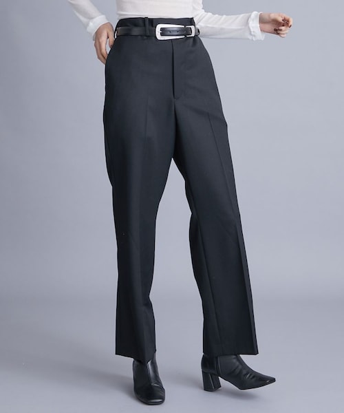 オンオフ問わず使える美シルエットのウールスラックス-Detail-シンプルなデザインのウールスラックス。太過ぎず細すぎず身体のラインを拾わない美しいシルエットです。フロントのウエスト部分にディテールが施され、ベルトなしでもスッキリとまとまった印象に。ブーツやパンプスに合わせてキレイめスタイルにはもちろん、スニーカー合わせでカジュアルスタイルにもおすすめです。-Fabric-上品な光沢感のあるウール100%素材です。
