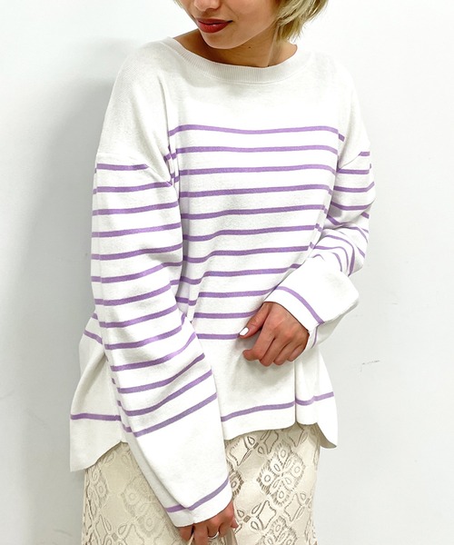 カラーボーダーが新しい、ワイドなシルエットのデザインニット 【素材】 膨らみがあり、ソフトで肌触りの良いコットン(綿)混の素材を使用。 総針で編立てた程よい厚みと、クリーンな表面感が魅力です。 ニット素材ですが、ご家庭で手洗いが可能なのもうれしいポイントです。 【デザイン】 ワイドなシルエットで、前振りに切り替えを入れて立体的に仕上げたデザインが特徴にプルオーバーニット。 前だけインしたり、アウトで着用しても決まるデザインに仕上げています。 すっきり見えるボートネックに、袖はふっくらとボリューム感を持たせ、デザインポイントに。 寒い時期には、タートルカットソーなどをインしてレイヤードも楽しめます。 ベーシックな黒に加え、鮮度のある春カラーが魅力のボーダーニットです。 --------------- 【C(シー) OPAQUE.CLIP】 「PLAYFUL FEMININE」をキーワードに、天然素材と美しくポジティブなカラー、 ワクワクするようなディティールや、ミックス感のあるスタイルなど ファッションの楽しさを詰め込んだ新レーベルです。 こちらの商品は主に春に着用いただける商品です。 モデル情報:身長163cm B80 W60 H89 着用サイズ:38(M) 店舗へのお問い合わせ商品番号:637-14018 ●製品寸法: 00(00):着丈61cm B120cm 袖丈49cm 肩幅50cm 備考: