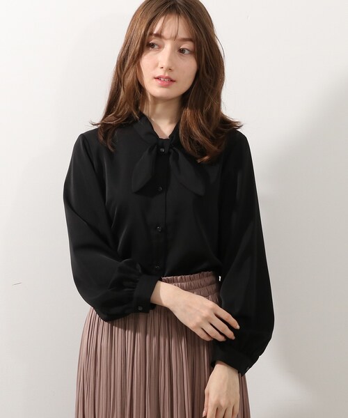 【デザイン】フロントのタブを通してリボン風に見えるボウタイブラウスです。パンツにもスカートにも合わせやすく、着まわし力のあるエレガントなデザインです。1枚ではもちろん、ジャケットインに合わせても顔周りをさりげなく華やかにしてくれます。【生地感】光沢感があり、滑らかな質感のポリエステル素材を使用しています。※オフホワイト(003)・カーキ&グリーン(020)・イエロー系(030)はやや透け感があるため、インナーの着用をおすすめします。こちらの商品は主に春に着用いただける商品です。モデル情報:身長163cm B81 W56 H82 着用サイズ:02(M)店舗へのお問い合わせ商品番号:741-84007●製品寸法:02(M):着丈58cm B94cm 袖丈54cm 肩幅39cm03(L):着丈59cm B97cm 袖丈55cm 肩幅40cm04(LL):着丈60cm B100cm 袖丈56cm 肩幅41cm備考: