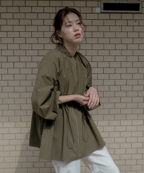 シーズンレスで使えるライトアウター。 ウエスト・袖口は調整できるドロスト仕様で、ウエストは絞るとすっきりとした印象に。袖口を絞ると、袖のボリューム感や袖丈を調整でき、様々なシルエットをお楽しみいただけます。バックスタイルはペプラムデザインで、ヒップラインがカバーできる着丈も嬉しいポイント。素材はストレッチ性があり、撥水加工が施されたポリエステル生地。さらりとした肌触りは春のアウターにはもちろん、梅雨の季節・夏の日焼け防止や冷房対策など、これからの季節に活躍します。 軽量でかなりコンパクトに畳めるので、持ち運びにも最適です。 ◇詳細◇ 生地の厚み:薄手 伸縮性:あり 透け感:なし 光沢感:なし 裏地:なし ポケット:あり ファスナー:あり その他:撥水加工素材 洗濯取扱い:ドライクリーニングのみ