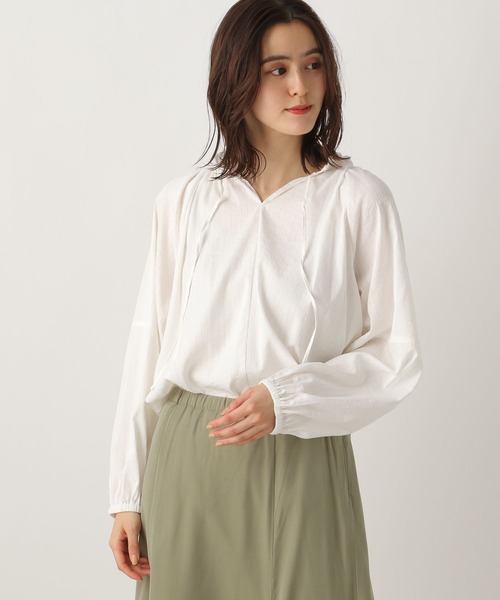 爽やかな印象のドビーブラウス《素材》ドビー素材を使用しているので、表面に織り柄模様があります。サラッとした肌触りで、着心地のいい生地です。《デザイン》程よい深さのVネックで抜け感があるデザイン。首元の紐は垂らしてままラフに着るのがおすすめです。長めの着丈で、バックはお尻が隠れるので安心感があります。袖口がゴムになっているので、腕まくりもしやすいのもポイント。《スタイリング》パンツと相性のいいシルエットです。テーパードやストレートパンツと合わせると、すっきりと着られます。春はデニムと合わせて、軽やかに着るのがおすすめです。-------------------------------------------------------【気になる商品はお気に入り登録がおすすめ!】・在庫残りわずか・再入荷・セールの情報などの通知を受け取ることができます。ぜひ♡をクリックして、気になる商品を「お気に入り登録」してくださいね!【ショップのお気に入り登録も!】新商品や再入荷、セール、クーポンの配布など、いち早くお得な情報を受け取ることができます。-------------------------------------------------------