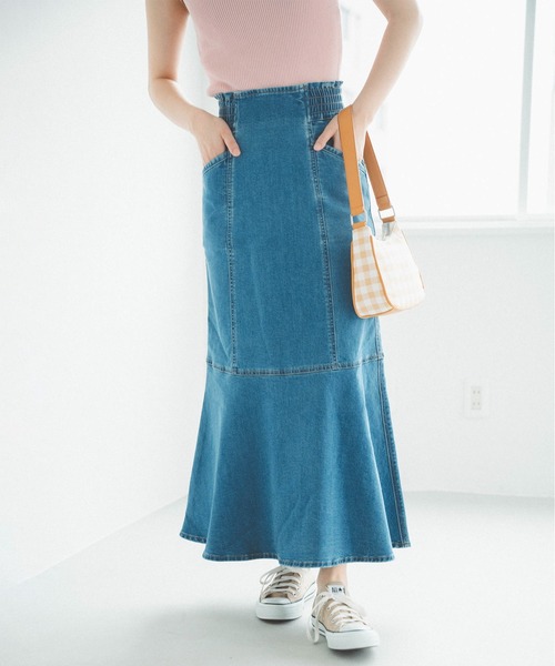 裾まわりに分量をだしたマーメイドシルエットのデニムスカート。コットン混のストレッチデニムを使用し、着用感も良く動きやすいです。ハイウエストでお腹周りをスッキリと見せながら、ウエストの両サイドはゴムを入れているのでラクな着心地です。Tシャツやカットソー、ブラウスとも合わせられるので、カジュアルにもフェミニンなスタイリングにも着まわしできます。※こちらの商品はXSサイズの展開がございます。◆サイズ目安◆XSサイズ→身長150cm~152cm ウエスト57cm~59cm