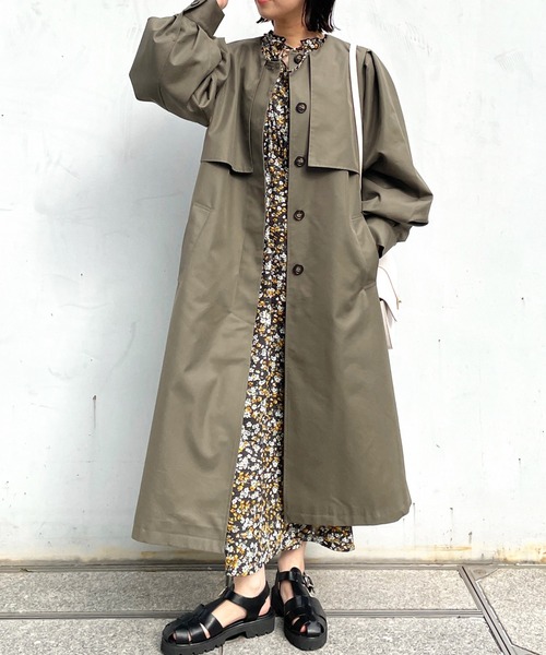 衿の取り外しが可能な、2Wayステンカラートレンチコート。 【素材】 コットンとポリエステルを高密度に織り上げ、しっかりとした肉感が特徴的なツイル素材を使用しています。 サスティナビリティとマルチファンクションの機能付き素材。 春らしく程よくハリ感があるので、ふんわりとしたボリューム感がでるのがポイント◎ ※裏地あり 【デザイン】 Aラインの裾にかけて華やかに広がる、フレアシルエット。 襟ぐり部分は取り外しができるため、ノーカラーコートとしても着用ができます。 肩のラインを少し内側に設定し、ボリューム感をもたせたデザインがトレンド感があり、こなれた雰囲気に仕上げてくれます。 ※ポケット数:横×2 【こだわり】 一枚で2通りの着こなし方が楽しめる、デザイントレンチコート。 前を開けてもしめてもきまるシルエットにおつくりしました。 ハンドウォッシャブル、撥水、花粉防止機能つき。 【スタッフコメント】 RINA(158 /骨格ウェーブ/ブルべ) トレンチコートは2wayで、襟を取り外してノーカラーコートにできるのが嬉しいポイント! 着丈長めなのでちょっと高さあるシューズで合わせるとすごく可愛いです! パンツスタイルでもバランス良くキマります! こちらの商品は主に春に着用いただける商品です。 モデル情報:身長163cm B80 W60 H89 着用サイズ:38(M) 店舗へのお問い合わせ商品番号:N02-94001 ●製品寸法: 38(M):着丈111cm B106cm 袖丈62cm 首周り18cm 肩幅39cm 備考:重量:約890g(サンプル重量)