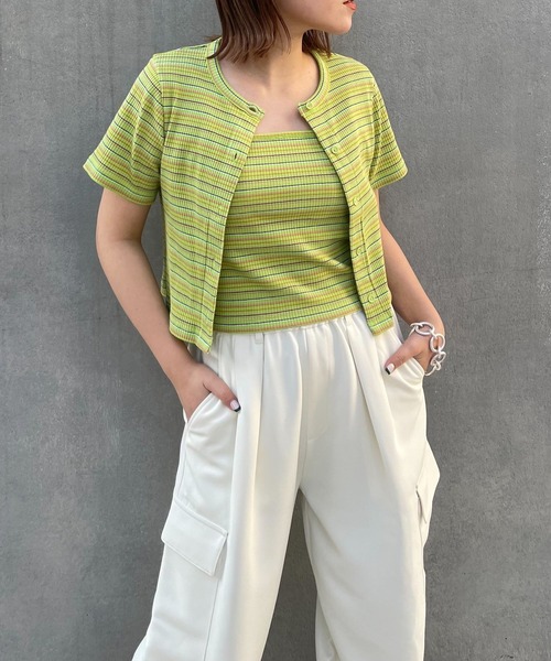 コンパクトなカーディガンとカップ付きのキャミソールがセットになったアンサンブル。細めなマルチボーダーで夏らしいアクセントになるアイテム。伸縮性がよく柔らかい着心地が特徴のリブ素材で、それぞれ別々で着用しても着回しが効きます。ハイウエストパンツやスカートにも相性抜群でトレンドコーデに仕上がること間違いなし。※サンプルにて撮影をしておりますので、実際の商品とは仕様や加工・サイズ等が若干異なる場合がございます。※撮影環境により、光の当たり具合で色味が違って見える場合があります。あらかじめご了承下さい。※ご注文いただいた予約商品のお届け時期の確認は、注文履歴ページより行えます。