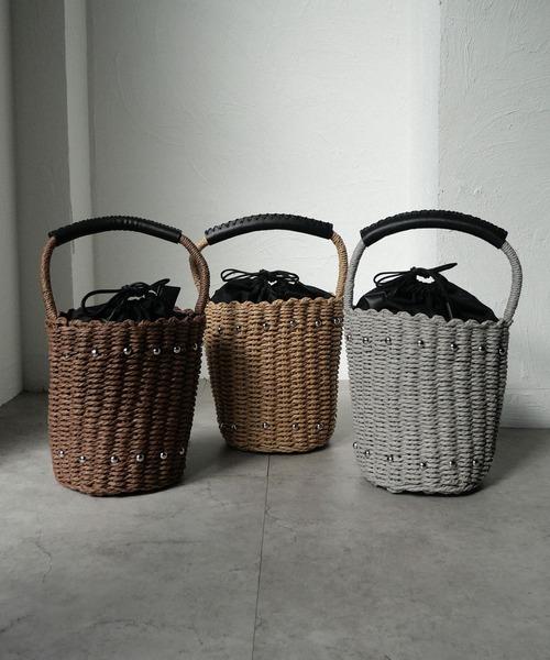 【スタッズ×巾着 カゴバッグ】《デザイン&シルエット》筒型のフォルムにスタッズを組み合わせた大人なデザイン。カジュアルになりすぎないよう、上品なカラーリングに仕上げました。小さめな見た目ですが、長財布が縦に入るなどサイズ感にこだわっています。スニーカーにもワンピースコーデにも合わせやすいデザインで、この春夏に活躍すること間違いなしです。《素材》カジュアルな風合いと軽さが魅力のペーパー素材に、ハンドルには程良い厚さのフェイクレザーを使用。《カラーバリエーション》□グレー□ブラウン□ベージュ×ブラック※ハンドルは「ブラック」統一です《サイズ》横:18cm 縦:20cm マチ:16cm《機能》内装にオープンポケット×1《ご注意》手作業で1点、1点編み上げる為、サイズに若干誤差が生じます。ご了承くださいませ。【CURIBISCUI(キュリビスキュイ)】東京恵比寿にある、オリジナルとセレクトで展開するバッグを中心としたファッション雑貨のブランドです。お洒落心をくすぐられるディティールを大切にし、本革やフェイクレザーなどのマテリアル、オリジナルプリントや高機能素材などのこだわりを持った物作りで展開しています。オンラインの商品は30代を意識したセレクトをおこなっております。✓気になるアイテムは「お気に入り登録」がおススメ!入荷状況やクーポン情報が通知されるようになります。