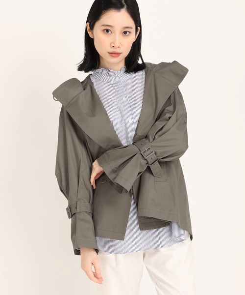 適度な光沢感のあるコットン100%ショートコート。ふわっとした袖とバックスタイルのセンタータックがアクセントに。襟からつながるフードが大人カジュアルな印象。羽織るだけで旬コーデにしてくれる優秀な1着です。洗濯:ドライクリーニング