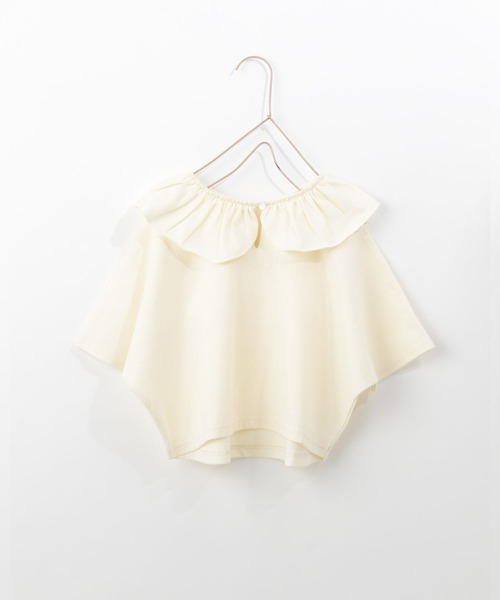 前後2WAY仕様のフリルプルオーバー。 前後でフリルのデザインが異なり、ドレープした大きなフリルと丸襟のフリル。 丸襟のフリルの方についているボタンループはゴムになっているので、ボタンが取り外しし易い仕様になっています! コンパクトなトップスなので、ワイドパンツやテーパードパンツ、ショートパンツとの合わせが相性◎ オーバーオールと合わせてガーリー要素をプラスしたスタイルもおすすめです!