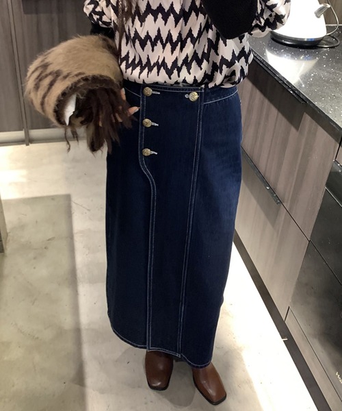 ☆個性的なデザイン☆ 前開きをダブルにした個性的なデザインが目を引きます♪ ヴィンテージゴールドの釦がポイントで、 古着のような雰囲気のある佇まいです♪ センターにスリットを施しているので足さばきも◎ ベーシックアイテムながらひと癖あるデザインで、 他とは違ったアイテムをお探しの方にもおすすめです♪ ☆カジュアルに使いやすい☆ デニムならではの使いやすさもポイント♪ カットソーやプルオーバーなどラフなアイテムとのコーデも きちんとおしゃれな印象に。 シャツなどきれいめアイテムとのコーデは ほどよい抜け感を演出できます。 シーズンレスで使えるのも嬉しいポイント♪ ☆ストレッチが効いたしっかりデニム☆ ストレッチが効いたデニム生地です♪ しっかりとした肉感で柔らかさもあるので履き心地がいいです。 ネイビー、ブラックの2色展開です。 【原産国】 中国