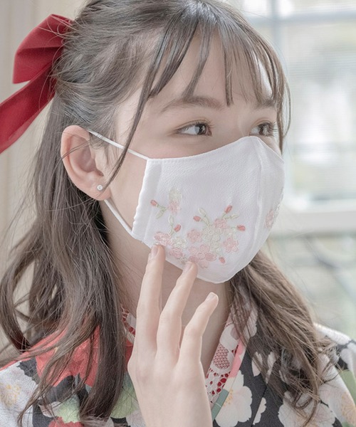 口元にも和の美意識 桜刺繍入りちりめんマスク まだまだマスク着用がマナーなご時世、 卒業式袴や成人式振袖など 大切な日の和装スタイルの口元をはんなり彩る 着物用マスクを作りました。 趣のあるちりめん生地に、大胆な刺繍を添えて。 和装スタイルの横顔でさえも華やかに演出します。 Point - 贅沢に入れた桜の刺繍で、艶やかな着物にも負けない華やかさを - 表はちりめん生地、肌にあたる裏面は綿100%生地を使っています Size 縦約14cm×横約18cm ※商品の素材や色合いなど、生産時期によって差異が生じます。