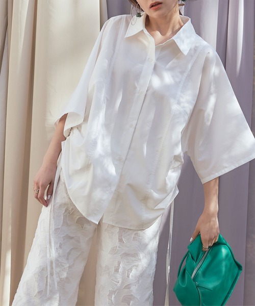 両サイドのドロストデザインがアクセントになったハーフスリーブオーバーシャツ。・サイドのドロストでシルエットの変化を楽しめるアイテム。・ゆったりとしたサイズ感で体型カバーを叶えます。・どんなボトムスとも合わせやすい1枚。・おしゃれな季節感あるカラーバリエーションでご用意しました。※当商品は機械による生産の過程上、どうしても"生地を織る際の糸の継ぎ目"や多少の"ほつれ"、他繊維の"混紡"、また、形やサイズや柄に多少の"誤差"が生じる場合がございます。※サイズは、実寸サイズを測っているため多少誤差がでる場合があります。製造工程の関係上、各採寸箇所実寸(平置き)より【約-3cm~+3cm】程度は誤差の許容範囲とさせて頂いておりますので、予めご了承くださいませ。※メーカーより密封状態で入庫し、検品時に再度袋詰めを行っておりますが、素材により染料等の臭いが強い場合がございます。※発送上の状態によって商品がシワになる場合がございます。※商品により色落ち・色移りがある場合がございますので、品質表示をご確認の上、お取り扱いにご注意くださいませ。【生地】ややハリ感のある薄手生地【伸縮性】なし【透け感】淡色に多少あり【裏地】なし