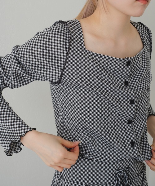 【2022SS カタログ掲載アイテム】 《SETUP対応》スクエアネックが女性らしい、ジャガードトップスが登場 ■デザイン 細かいギンガムチェックと、さりげなく表面感のあるジャガード素材がポイントになる1着。 スクエアネックがデコルテラインを綺麗にみせてくれ、女性らしい印象を演出してくれます。 袖口と裾にはさりげないメロウのデザインがあしらわれています。 伸縮性のある軽めの素材なので、サラッと着用いただけて着心地も抜群です。 SETUP対応アイテム: KAZ1021101A0002 ギンガムジャガードIラインスカート ■コーディネート 同じ素材のスカート ( お問い合わせ番号:KAZ1021101A0002 )と合わせてSETUPでワンピース風に着用頂くのがオススメです。 Iラインのスカートと合わせるとグッと女性らしく、 デニムやカラーパンツで合わせるとカジュアルダウンし雰囲気を変えて着用頂けます。 ■素材・洗濯表示 素材:ポリエステル95% , ポリウレタン5% 洗濯:手洗いで洗濯可 タンブル乾燥:不可 アイロン:150℃まで可 ※サイズ採寸は各モールによって異なり、多少の誤差が生じる可能性がありますのでご了承ください。 ※撮影画像はサンプル品を使用しているため、実際の商品と仕様、加工、サイズが若干異なる場合がございます。また、可能な限り実物に近いカラーにて掲載していますが、使用しているパソコンのモニター設定や、携帯電話 のメーカー・機種により実際のカラーと異なって見える場合がございます。予めご了承ください。 ▼商品のお気に入り登録 ハートマークをクリックし、お好きなカラーを選んでお気に入りに登録 完売カラーの再入荷通知や、ラスト1点の通知、セールの通知も受け取ることができます。 ▼ブランドのお気に入り登録 新商品や再入荷等、いち早くブランドのお得な情報を受け取ることができます。 <返品・キャンセルについて> ・着用・洗濯後の返品・ご交換は致しかねます。 ・商品到着後、着用前に商品を確認して頂きますようお願い致します。 ※生産時期により色・素材・サイズ感など多少異なる場合がございます。 ※掲載画像の商品の色味は、屋外や屋内の光の照射や角度により実物と色味が異なる場合がございます。 また表示のサイズ感と実物は若干異なる場合もございますので、予めご了承ください。