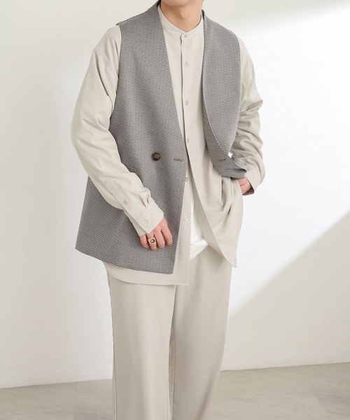 上品さのある春らしいチェック柄ベスト! 羽織るだけで簡単にトレンドのレイヤードスタイルを完成させるアイテム ○程良くゆったりとしたサイズ感 ○フロントボタンはトレンドのダブルブレスト ○深めのアームホールにすることでトレンドのビッグシルエットアイテムとの相性も〇 styling きれいめでもカジュアルでもマッチするので、幅広いコーディネートをお楽しみいただけます。スキニーなど細身のパンツはもちろん、ワイドと合わせることで旬な装いに。インナーにフード付きのパーカーを合わせてシティカジュアルなスタイルも◯きれいめなバンドカラーシャツなどと合わせても相性抜群です。 material 程良い微光沢があり、高級感とドレープ性が魅力的 ※この商品は激しい運動や強い力がかかると、滑脱(縫い目が滑って開いたり、縫いしろが抜ける)したり目寄れ(織り糸が滑って片寄り、織り目が開く)することがあります。ご着用の際はご注意ください。 ※商品画像は、光の当たり具合やパソコンなどの閲覧環境により、実際の色味と異なって見える場合がございます。予めご了承ください。 ※商品の色味の目安は、商品単体の画像をご参照ください。 ----------------------------- 透け感:なし 伸縮性:なし 裏地:あり 光沢:なし ポケット:あり -----------------------------