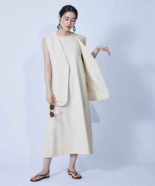 【素材】 ソフトな風合いのポリエステルツイル素材。シワになりにくくイージーケアが可能。 【デザイン・シルエット】 シャープなVネックラインとソフトボートネックの2way仕様のレイヤードワンピース。ミニマルIラインで、より女性らしさを感じるシルエットに仕上げています。 【カラー】 大人ベーシックな2カラー展開 【その他ポイント】 同素材でセットアップでも着られる エステルソフトツイル2WAYワンピース(品番:GGE52000) エステルソフトツイルスリーブレスジャケット (品番:GGJ52000) エステルソフトツイルイージータックテーパードパンツ (品番:GGS52000) もございます。 【おすすめのスタイリング】 インナーに合わせるもののテイストで印象を変化でき、幅広いスタイリングが楽しめます。カジュアルなボーダーに合わせたマリンスタイルや、ボウタイなどに合わせたフェミニンスタイルもオススメです。 ---------------------------- 透け感:なし 裏地:なし 伸縮性:なし 光沢感:なし 生地の厚さ:中肉 ポケット:あり 開き:横ファスナー 洗濯方法:手洗い可能 ---------------------------- 【モデル情報】 モデル身長:167cm 着用サイズ:38 オフホワイト(15)は、(品番:GGJ52000)をレイヤードして着用しております。 ※画像の商品はサンプルです。 実際の商品と仕様、加工、サイズが若干異なる場合がございます。 ※室外で撮影している画像は、光の影響で色味が若干異なって見える場合がございます。 ※商品の入荷状況は、店舗までお問い合わせをお願いいたします。 ※店舗での商品のお取り扱いについて、ROPE'の商品は、ROPE'実店舗のみの取り扱いになります。