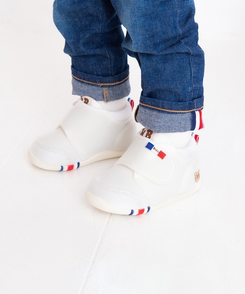 【ファーストシューズ】よちよちあんよが始まったベビーちゃんにおススメミキハウスホットビスケッツのシューズは未熟な赤ちゃんの足と、歩行を助けるためのこだわりがたくさん。・つまさきにゆとりと丸みある設計で、足の指を使ってしっかり地面をつかめるように。・赤ちゃんの足が倒れ込みにくいように、固めのかかとで固定し、歩行を安定させます。・自然な歩行を促せるように、足の曲がる位置でソールが柔軟に曲がるように設計されています。《その他》・いっぱい汗をかく赤ちゃんのために通気性の良いポリエステルメッシュの素材・カップインソールでお手入れも簡単に。適度なクッション性とシューズへのフィット感があります。・甲のベルトは面ファスナー。お子様の足にぴったりと合わせて留められます。・刺繍がかかとにワンポイントで入っていて、全体的にでシンプルデザインです。●靴箱付き(ご奉仕品につきましては付属していない場合がございます。)※面ファスナーとは、マジックテープのことです。(「マジックテープ」は(株)クラレの登録商標です。)