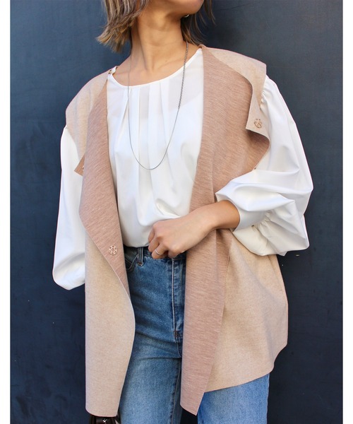 WEB限定 【切りっぱなしの生地がナチュラルな抜け感を漂わすジレ】 スマートで無駄のない洗練された仕上がりに。 ▼Design ・フロントはスナップボタンですっきりとした仕上がりに。 ・サイドには便利なポケット付き◎ ・バックに入ったスリットが抜け感を演出。 ・ダブルフェイスのデザインが大人の上品な雰囲気を漂わします。 ▼Fabric ・柔らかな素材感なので着心地も快適です◎ ・落ち感ある質感で女性らしい雰囲気がグッと高まります。 ▼Styling ・合わせるインナー次第で様々な着こなしを楽しめるのも◎ ・ボタンを外してラフに羽織ればこなれ感たっぷりの着こなしが完成。 ・ボタンを閉めたベストスタイルもラフな仕上がりになるのでおすすめです。 ・スカートとの合わせでは気品溢れるフェミニンな仕上がりに。 ----------------------------------------- 【以下グレー参考。カラーにより多少の誤差あり】 ・透け感:透けない ・伸縮性:あり ・生地の厚さ:薄い ・裏地:なし ----------------------------------------- 【スタッフ着用コメント】 身長159C㎝ ダブルフェイスのデザインが落ち着きある印象に仕立ててくれます。 ラフなアイテムとも、フォーマルなアイテムとも相性が良いので様々なシーンで着用いただけます。 かっちりとしたアイテムですが着た感じは軽く、楽に着れるのもとても魅力的です。 合わせるトップス次第でコーデ全体の雰囲気もガラッと変わるので一枚持っておくと、スタイリングをより楽しめるアイテムとなっています。