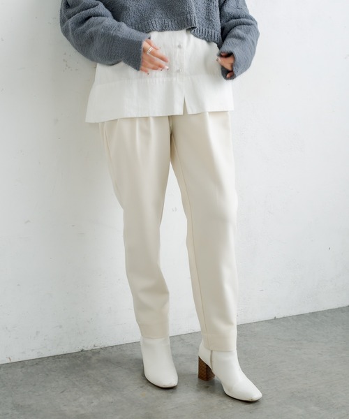 ピュアルセシン 2022 spring collection【Loose andclassical】 ◇オンオフ着られる万能テーパードパンツ◇ ●デザイン ウエストの紐で絞るドローストリングのデザインが目を惹くパンツ。 定番で人気のあるテーパードのシルエットは、裾に向かって細くなり、脚のラインを程よくカバーします。 左右2本ずつタックを施すことで、腰周りにゆとりがあり、とても着やすくデザインされています。 ジャージの様な柔らかな質感でストレッチが効いており、ストレスフリーな着心地です◎ ほど良い張りがありシワが気になりにくく、気軽にオンオフ着ていただけます。 ●カラー展開 春らしいアイボリー、ベージュ お仕事にも使いやすいグレー、ネイビーの4色展開です。 ●素材 程よく厚みがあり、艶感を抑えたストレッチ生地。 レーヨン混で肌あたりが柔らかくなっています。 ●スタイリング インのスタイルでウエストデザインを見せて着ると脚長効果がありオススメです。 タックの影で縦見えするので、インが苦手な方はオーバーで腰丈のトップスを選ぶとバランス良いです。 足元は、パンプスでオンスタイル。スニーカーでオフの日にも。どちらも似合う1着です。 ============================ 透け感:アイボリーややあり 裏地:なし 伸縮性:あり 光沢感:なし 生地の厚さ:普通 【スタッフコメント】 年齢:30代後半/身長:154cm/普段着用サイズ:Mサイズ サイズ感:脚のラインを拾わずに着られました。アイボリーはやや透け感があるのでベージュ系のレギンスを合わせようと思います。 素材感:ジャージの様な生地感ですが、マットなカラーの見え方で高級感があります。 =============================== ※撮影場所やお使いのモニター環境により若干お色味が異なる場合がございます。特にロケの撮影では明るく見える傾向にございます。 ※予約商品はサンプルで撮影をしております。若干の仕様が変更になる場合がございますので予めご了承の上ご注文くださいますようお願いいたします 。