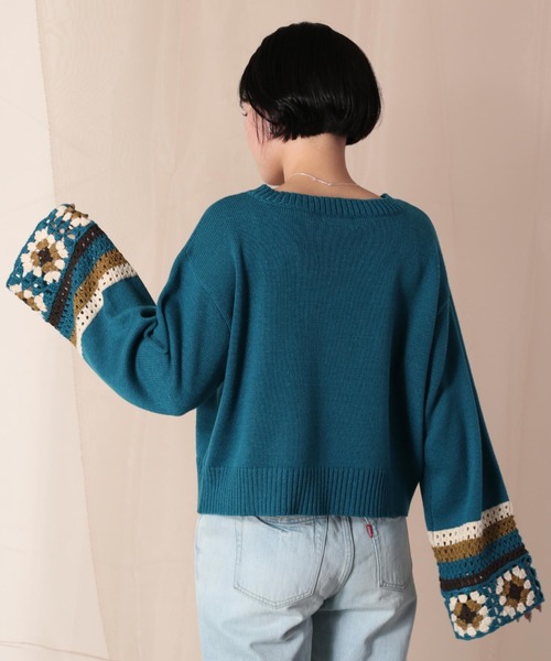 袖口のクロシェデザインがコーデのアクセントに◇Point◇袖口のクロシェが華やかなデザインのニット。1点投入で春めいた着こなしになります◎◇Material◇しわになりにくく、丈夫なポリエステル素材。肉厚すぎず、ハイネックインナーも着込める生地感・サイズ感です。◇Coordinate◇無地のボトムがマスト。デニム素材と相性がいいです◎スカートはタイトやマーメイドなどすっきりシルエットのものとよく合います。フレアシルエットやワイドシルエットのパンツ合わせも今季らしくておすすめ!