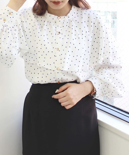 2022 SS 春アイテム 【大きなケープデザインが目を惹く大人かわいいブラウスの登場。】 ケープを羽織ったようなデザインがフェミニンさを強調するブラウス。 ▼Design ・大きめのケープが目を引くデザイン◎ ・どんなボトムにも合わせやすいシンプルなワンカラーデザイン。 ・コーデがワントーンになりにくい、配色デザインやドットデザインも。 ・長すぎない丈感でボトムスにインしてもすっきり◎ ・ゴールドカラーのボタンがワンランク上の上品さを見せてくれます。 ▼Fabric ・とろみのある生地感で大人レディなしなやかさを演出◎ ・ポリエステル100%使用なのでシワになりにくく保管しやすい。 ▼Styling ・ジャンスカのインナーがおすすめ◎ ・一枚でワイドデニムとの合わせでシンプルカジュアルに。 ・ボリュームのあるスカートでフェミニンにも。 ・マーメイドスカートやテーパードパンツとの合わせで、入学式(入園式)卒業式(卒園式)でも◎ ・キレイめなミディ丈スカートとの合わせでオフィスコーデにも。 ・どんなアイテムにも合わせやすいので、お持ちのお洋服でコーデの幅が広がる1枚です♪ ----------------------------------------- 【以下オフホワイト/クロ参考。カラーにより多少の誤差あり】 ・透け感:透ける ・伸縮性:なし ・生地の厚さ:薄い ・裏地:なし ----------------------------------------- 【スタッフ着用コメント】 身長159cm 女性らしい印象で着ていただけるこちらのアイテム。 優しい印象で、ふんわりケープデザインが上品なので、 新生活を迎える方にぜひおすすめしたいブラウスです。 大人気アイテムなので気になる方はお早めにチェックを!
