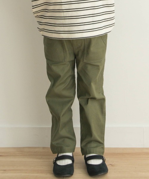 オールシーズン着用可能な万能ベイカーパンツ。 今季は深みのあるカーキでご用意し、よりコーディネートに馴染みやすくなりました。 すっきりとしたテーパードシルエットが大人びた印象に仕上げてくれる一着です。 ミリタリーアイテムにはお馴染みのバックサテン生地で仕上げ、大人顔負けの本格的な面構えが魅力。滑りのいい素材なので穿き着心地も抜群。小さなお子様にも嬉しい着脱簡単なウエストゴム仕様。 お子様のワードローブにぜひ加えたいアイテムです。 [サイズ] 105=100~110cm 120=115~125cm 135=130~140cm 150=145~155cm ※サイズは目安です。採寸表をご参照ください。 ※この商品のファスナー部分はフェイクです。予めご了承ください。 ※商品画像は、光の当たり具合やパソコンなどの閲覧環境により、実際の色味と異なって見える場合がございます。予めご了承ください。 ※商品の色味の目安は、商品単体の画像をご参照ください。 ▼お気に入り登録のおすすめ▼ お気に入り登録商品は、マイページにて現在の価格情報や在庫状況の確認が可能です。 お買い物リストの管理に是非ご利用下さい。 ----------------------------- 透け感:なし 伸縮性:ややあり 裏地:なし 光沢:なし ポケット:あり -----------------------------