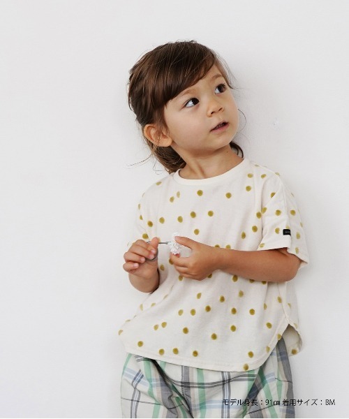 Quoti use FITHで毎シーズンご好評いただいているオリジナル素材を使用した半袖Tシャツ。柔らかく、着心地抜群の綿100%で凹凸のドット柄が特徴的。ドロップショルダーにちょこんとついた半袖がなんとも可愛らしいシルエット。裾は大きなラウンドで、後身頃はおしりが半分隠れるくらいの着丈。ベビーには9122536のブルマとセットアップもお薦めのアイテム。