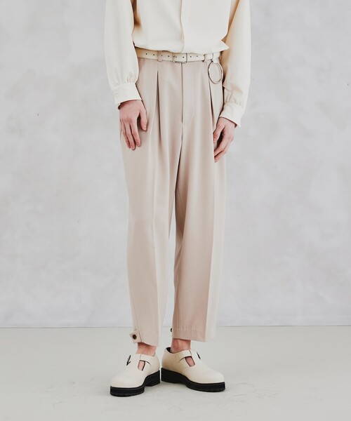 2WAYデザインが楽しめるベルテッドパンツ【素材】リネンライクな表面感とストレッチ性のある素材を使用。涼し気な印象とリラックス感のあるアイテムです。【デザイン】裾部分にタブとボタンを付けているのでワイドシルエットと、テーパードシルエットの2WAYで楽しめるデザインが最大の特徴。インバーテッドプリーツで腰回りにゆとりを入れたワイドテーパードシルエットでトレンド感のあるディティールに。今季らしいナチュラルなカラーも展開しており注目となっています。【スタイリング】幅広いアイテムとの相性が◎RITAファブリック カバーオール(商品番号170-54101)などのアイテムと組み合わせるとミリタリーな雰囲気を演出できオススメとなっています。- BRAND CONCEPT -時代を超えて支持されるトラディショナルなアイテムをベースに、アソビ心とストリートの自由な発想を取り入れ、日本独自のミックススタイルを提案します。※ポケット数:横×2、後ろ×2※裏地なし※ベージュ(052)はやや透け感があるため、インナーの着用をおすすめします。こちらの商品は主に春に着用いただける商品です。モデル情報:身長175cm B83 W66 H87 着用サイズ:03(L)店舗へのお問い合わせ商品番号:170-74105●製品寸法:02(M):W79cm H111cm 股下71cm 前股上29cm 渡り幅35cm 裾幅26cm03(L):W83cm H115cm 股下73cm 前股上29cm 渡り幅36cm 裾幅27cm66(WOMENS FREE):W72cm H107cm 股下67cm 前股上28cm 渡り幅33cm 裾幅26cm備考: