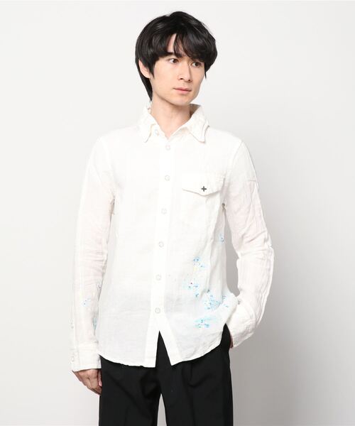 cherry sunburst-リネンペイントシャツ-RINEN PEINT SHホワイトのリネンシャツにペイントが施されたデザイン。大人っぽい雰囲気もありつつ遊び心のあるアイテムに仕上がっています。【Cherry Sunburst/チェリー サンバースト】自分なりの価値観を持つ、ブレない男のMY STANDARD 普遍的なアイテムにこそ求められる「ひねりの利いたディテール」と「確実なる進化を遂げた完成度」をあくまで独自の世界観で表現。時代に媚びず、服が持つ本質的な意味、要素、必要性をデザイン、ディテール・クオリティで唱え、密接したスタンダードとモードの橋渡し的なリアルクローズだけを創り出す。