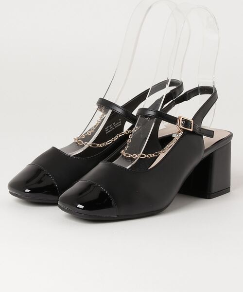 ヒール=約6cm華奢で女性らしいチェーンストラップ付のバックストラップパンプス。着用するだけで、まるでアクセサリーを纏っているかのような、おしゃれ心をくすぐる1足です。 チェーンは取外し可能なので、ONOFFで使いが可能です。太めのデザインヒールに加えて、厚めのクッションインソール内蔵で、シーンを選ばず活躍します!