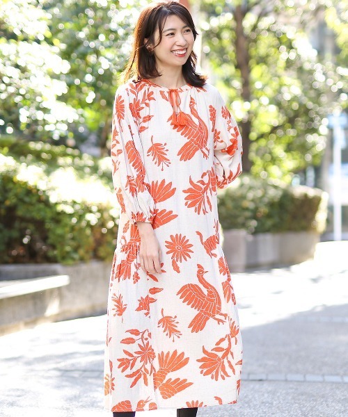 賑やかな柄に思わず見とれてしまうオトミプリントワンピース ■デザイン メキシコに住むオトミ族に代々伝わる、刺繍の柄をモチーフにしたデザイン。 中南米に生息しているアルマジロなどの動物や植物を手書き風にプリント! 大人っぽく2色のみで仕上げることで、落ち着いた華やかさを演出しました。 ゆったりとしたふんわり袖、タッセル付きの襟元で抜け感をプラスしています。 ■サイズ感 レディースフリーサイズ 身頃部分は程よくゆったりとしたサイズ感。 スカートのサイド部分にタックを施すことで、広がりすぎない落ち着いたボリュームのあるシルエットになっています。 ■素材感 ちょっぴりとろみ感があり、柔らかく軽やかな生地を使用しています。 ■スタイリング ワンピースを主役にシンプルなワイドパンツやレギンスを組み合わせることで印象が変わります! また、インナーの袖の長さを変えることでオールシーズン着まわすことが可能◎ ■カラー アイボリー/ブラック --------------------------------- 透け感:透けない 伸縮性:なし 裏地:なし 光沢:なし 生地の厚さ:普通 ポケット:なし --------------------------------- 【TITICACAのお買い物をお楽しみいただくために!】 ▼商品のお気に入り登録 完売カラーの再入荷通知や、ラスト1点の通知、セールの通知も受け取ることができます。 ▼ブランドのお気に入り登録 新商品や再入荷など、いち早くブランドのお得な情報を受け取ることができます!