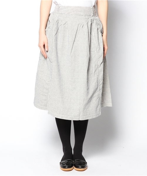 オーバーダイ加工を施した、ヒッコリーの膝下丈のスカート。ワークなメンズライクな素材感も、タックを入れて程よい広がりが女性らしさを演出。ざっくりニットと合わせて、ナチュラルコーデをお楽しみ下さい!!modelH165 B80 W62 H88 着用サイズ:MEDIUM