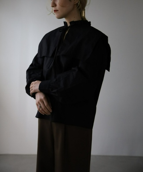 《スタイリング》 マーメイドスカートや、ゆったりとしたボーイズデニムとスニーカーを合わせたカジュアルな着こなしがおすすめです。 寒い日にはベストやセーターの下に合わせてセーラーカラーをメインにしたコーディネートも◎ 《ディティール&生地感》 ハリのある素材で春先には1枚で着用できます。 上品なスタンドフリルカラーとボリュームのある袖に施されたタック切り替えがトレンド感のあるブラウスです。 前あきがVネックデザインなので甘すぎず大人な女性の印象に* -------------------------------------------------------------------------------------------------------------- 【Information】 ◆《お気に入り登録》がオススメ◆ ・「商品のお気に入り登録」で再入荷通知や、ラストの通知、セール通知も受け取ることが出来ます。 ・「ブランドのお気に入り登録」で新商品や再入荷など、お得な情報を受け取ることが出来ます。 ※自然光での撮影を行っているため、PCやスマートフォンの環境により写真の色味が実際の商品と異なって見える場合がございます。ご了承の上お買い求め下さいませ。※サイト上のカラー名と、お届け商品に記載されているカラー名が異なる場合がございます。