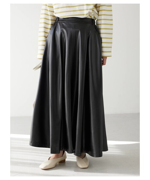 たっぷりのツヤ感がスタイリッシュな印象の合皮ストレッチレザースカート。 ドレープの効いたAラインシルエットが女性らしいニュアンスに。絶妙な甘辛MIXがコーデに映える一枚に仕立てました。 ウエスト後ろはゴム仕様で着脱しやすく、締め付け感ゼロなのもポイント◎トップスインでスマートに着こなすのもおすすめです。 透け感[無し] 裏地[無し] 伸縮性[やや有り] 光沢感[やや有り] 生地の厚さ[普通] 付属品[無し] ポケット[有り]前2つ