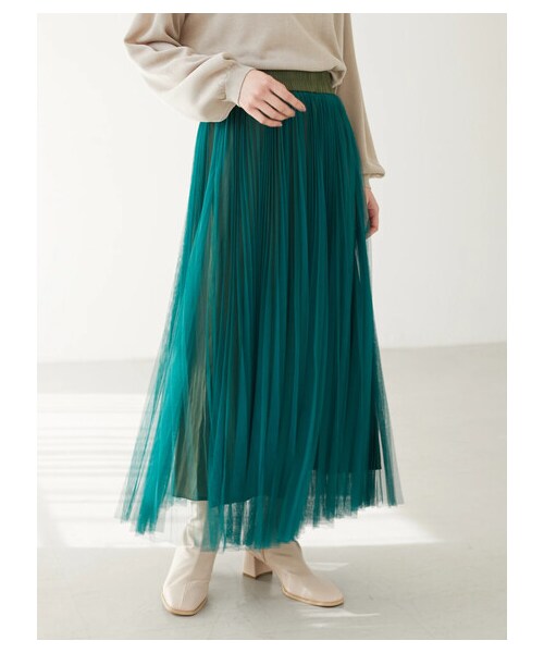 繊細なプリーツにエアリーなチュールをのせたフェミニンなスカート。 レーヨンを含むしっとりとした素材が広がりを抑え、上品な装いに◎脚線を拾わないシルエットなので、美脚にも効果的です。ウエストは総ゴム仕様で締め付け感ゼロなのも嬉しいポイント。 コーデにプラスするだけで、華やぎへと導いてくれるアイテムです。 透け感[無し]※イエローはややあり 裏地[無し] 伸縮性[無し] 光沢感[無し] 生地の厚さ[薄手] 付属品[無し] ポケット[無し]