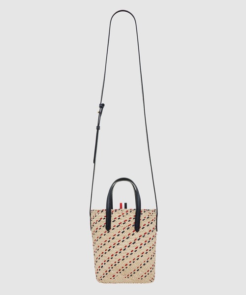 THOM BROWNEThom Browneは、挑戦的で近代的な今日のユニフォーム“スーツ“によって幅広く認知されている。伝統的なスーツのプロポーションを問うことにより、トムのデザインは質の高いクラフトマンシップと正確なテーラリングに根差した真のアメリカの感性を一貫して伝えている。2001 年に、トムはニューヨークのウェストビレッジにある小さな予約制のショップで、5 着のスーツからビジネスをスタートさせ、その後、数年でメンズ(2003年)とウィメンズ(2011年)のレディ・トゥ・ウェア及びアクセサリーコレクションをスタートするまでに至った。彼は挑発的かつ演劇的なテーマ、セットで世界的に注目を集めている非常にコンセプチュアルなランウェイプレゼンテーションでも知られている。トムは、CFDA Menswear Designer of the Year Award (2006 ,2013 ,2016年)、GQ Designer of the Year (2008年)、FIT Couture Council Award (2017年)、Cooper Hewitt National Design Award(2012年) をこれまでに受賞している。トムのデザインは、メトロポリタン美術館のCostume Institute、ニューヨーク近代美術館、ヴィクトリア・アンド・アルバート博物館、バースのコスチューム博物館、そしてアントワープのモード美術館をはじめとする世界中の美術館より評価されている。現在、300 店舗以上の主要百貨店をはじめ、40 カ国に渡るセレクトショップの他、ニューヨーク、ロンドン、ミラノ、東京、香港、北京、上海、韓国などの主要都市に計68店舗の直営店、旗艦店、ショップインショップを構えている。トリコロールカラーをデザインしたストロー素材のショルダーバッグ。