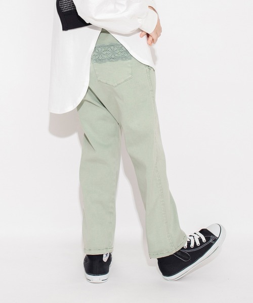 後ろポケットの花柄レースがポイントのストレートパンツ デニムにはブリーチ加工・カーキにはフェード加工を施しており、色落ち感が程よいかっこいいパンツに仕上げています。 ステッチも少し太めにすることで、カジュアルな雰囲気に Tシャツをインしたコーデ、少し長めの丈感のTシャツとのコーデなどトップスを選ばず使って頂ける万能パンツ! ウエストは総ゴムなので着脱しやすいです。 ----- 透け感:なし 伸縮性:なし 裏地:なし ポケット:あり ウエストゴム調整:可 ※商品によって加工具合に差があります。 ※モデル着用写真についてはイメージの為、実際の 商品とカラーや仕様が異なる場合がございますので、 商品画像をご覧ください。 ※商品の色味につきまして、お客様のお使いのPCの モニター環境により実際のカラーと画像の色味が 違って見える場合が御座います。 予めご了承の上、ご注文下さい。 ※店頭・外での撮影画像は光の加減で、 実際の商品より明るく見える場合が御座います。