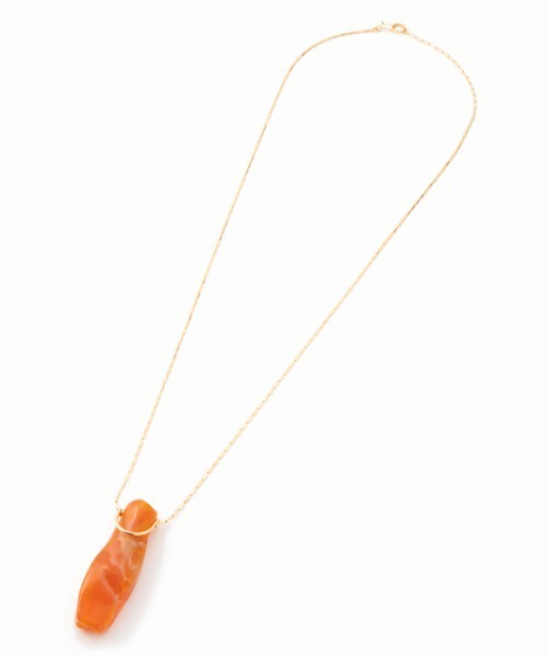 ポリエステル樹脂を天然石のような質感と色で仕上げたネックレスです。アイボリーはクリスタル、パープルはフローライト、オレンジはカーネリアンをイメージしています。パーツフロントにあるメタルリングにサングラスもかけられます。 ※画像の商品は光の照射や角度により、実物と色味が異なる場合がございます。また表示のサイズ感と実物は若干異なる場合もございますので、予めご了承ください。 ※お取り扱いの際は、商品についている品質表示とアテンションタグを必ずご確認下さい。 <<LAPUIS/ラピュイ>> 這う。 沿う。 彩る。 マテリアルと曲線が織りなす装飾。 自然やアートからのインスピレーションを元に 繊細で、美しく、 日常と洋服の中に佇む存在でありたい。 <<お知らせ>> ◆商品のお気に入り登録◆ お気に入りアイテムの値下げ・再入荷・在庫1点などの通知を受け取ることができます。 ◆ブランドのお気に入り登録 ◆ 新商品や再入荷、セール、クーポン配布などお得な情報を受け取ることができます。
