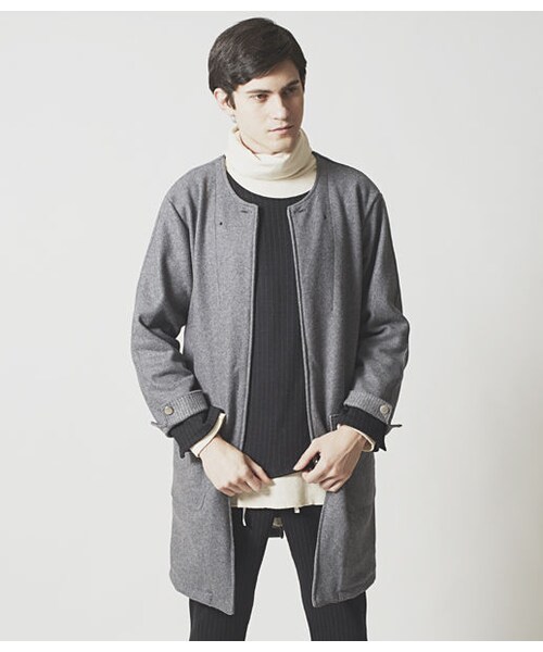 Bernabeu / ベルナベウ ブランド名【Bernabeu(ベルナベウ)】ブランド名はスペインのフットボールスタジアムや地名などで有名な言葉。ブランドのコンセプトは、デザイナー自身のルーツにあるヴィンテージウェアや音楽、過去の興味深い人物やスタイルに於けるアンダーグラウンドなムーブメントやカルチャー、それらへ今現在インスピレーションを受けている事柄、今現在の自身スタイルや感性を組み込み現代的なエッセンスを加え、新しい洋服、新たなスタイルとして再構築し提案する。"STYLE over FASHION - トレンド/ファッションに囚われない新たなスタイルの提案” BER-4C-O1035 圧縮ウール天竺コンビネーション×テンセルサーモトロン天竺ノーカラーライニングコート ウールを使用した天竺素材を圧縮し、メルトンの様な質感に仕上げた素材を使用したノーカラーコート。袖口裏、見返しに同素材のピンストライプを使用しており、附属のチェンジボタンの付け替えによって様々な見せ方が可能になっています。裏地にはスポーツ衣料などに使用される蓄熱糸「サーモトロン」とテンセルの混紡糸を使用。表地、裏地の素材の特性上、非常に軽さがありながらもしっかりとした保温性を持ち、ストレスの無い着用感を持っています。ノーカラーデザイン、ゆとりを持たせたサイジング、素材の高い伸縮性の為、ライトアウターの上から着用することも可能であり、着用者の個性にもよって様々に合わせることが可能なアイテムとなっています。 36サイズスペック: 身幅 57cm 着丈 92cm 肩幅 52cm 袖丈 57cm 38サイズスペック: 身幅 59cm 着丈 93cm 肩幅 53cm 袖丈 59cm ベース: WOOL 90% NYLON 5% OTHER 5% ライニング: TENCEL 74% POLYESTER 26% COLOR: L.GRAY×WHITE