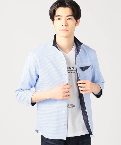 地柄のリンクスジャカード生地を使用した布帛コンビのイタリアンカラーカットソーシャツになります。伸縮性に富みメッシュ調のカットソー生地を採用しているので夏場などの暑い時期でも快適に着用頂ける1着に仕上げています。アクセントとして衿裏、袖口裏に市松柄のジャカード素材を、シルエットを綺麗に保つために衿端にワイヤーを入れ大人なカットソーシャツに仕上げています。衿端に付属としてプラスティック線材を使用しています。局部的に繰り返し折り曲げたり、その部分にアイロンをあてないで下さい。