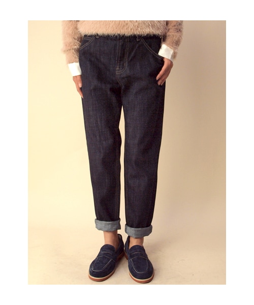 ボーイフレンド型が可愛いデニムパンツ。ニットプルオーバーに足元は女子靴コーデもオススメです。定番をお持ちの方にはダメージVer.もオススメです。※後ろウエストにゴムが入ります。